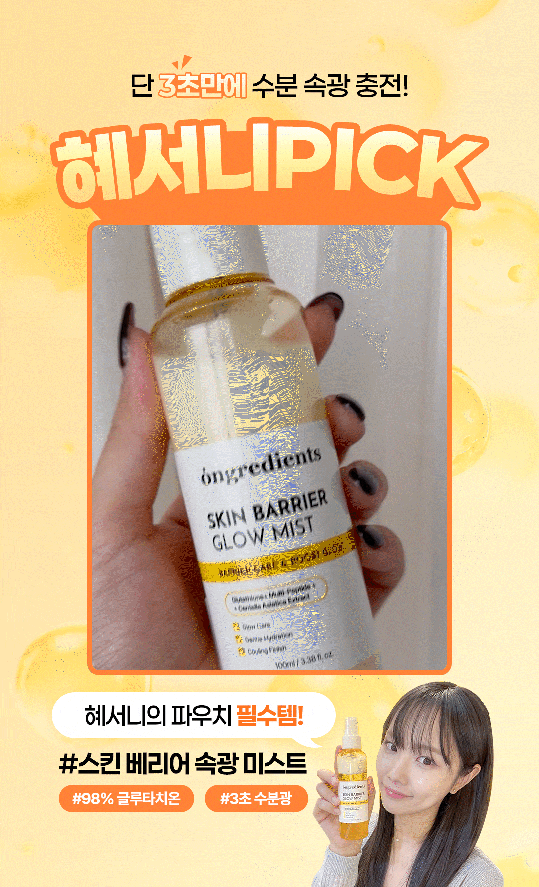 단 3초면 칙칙해진 안색에 맑은 수분 광채가 즉각적으로 차오릅니다.